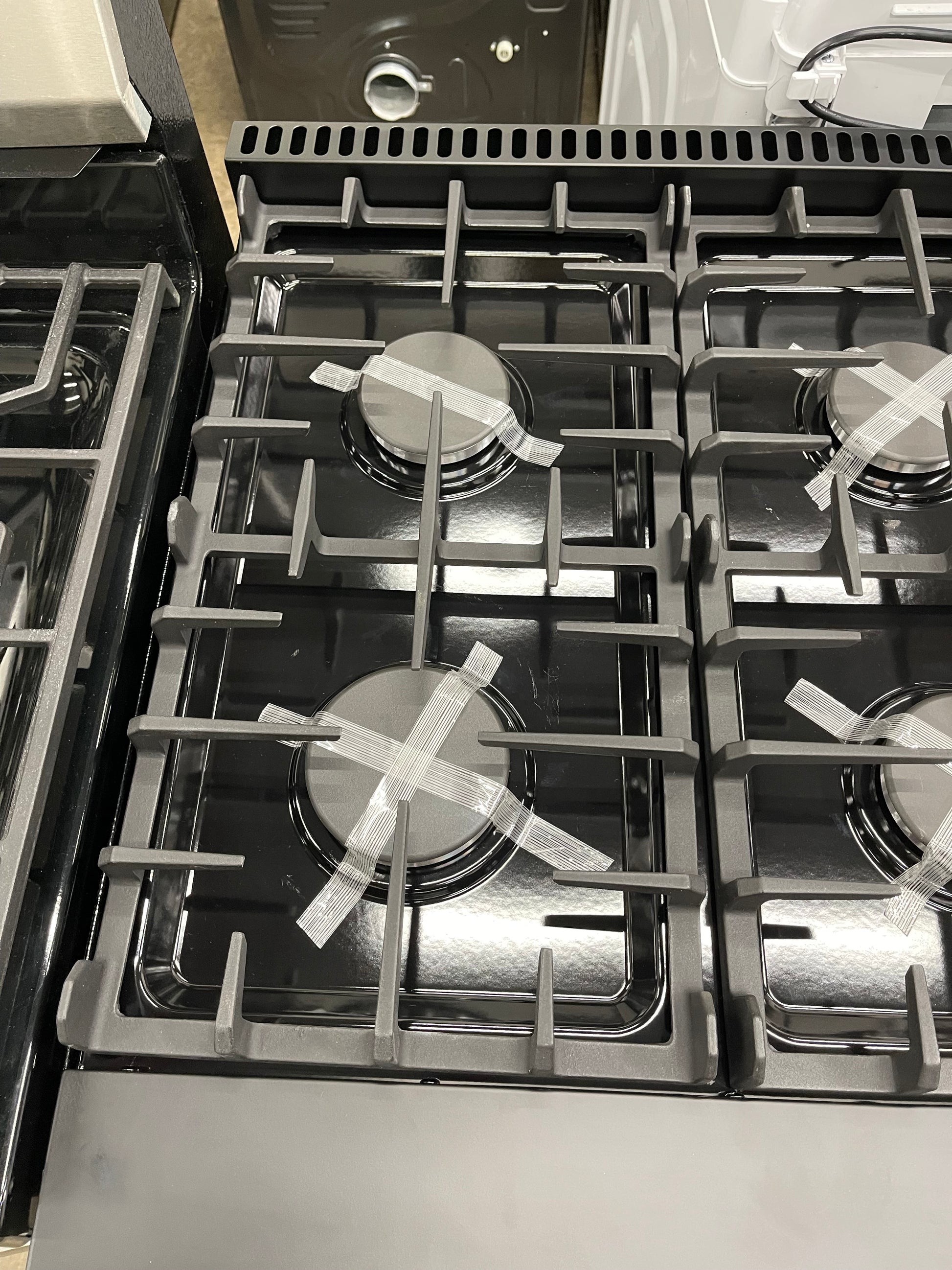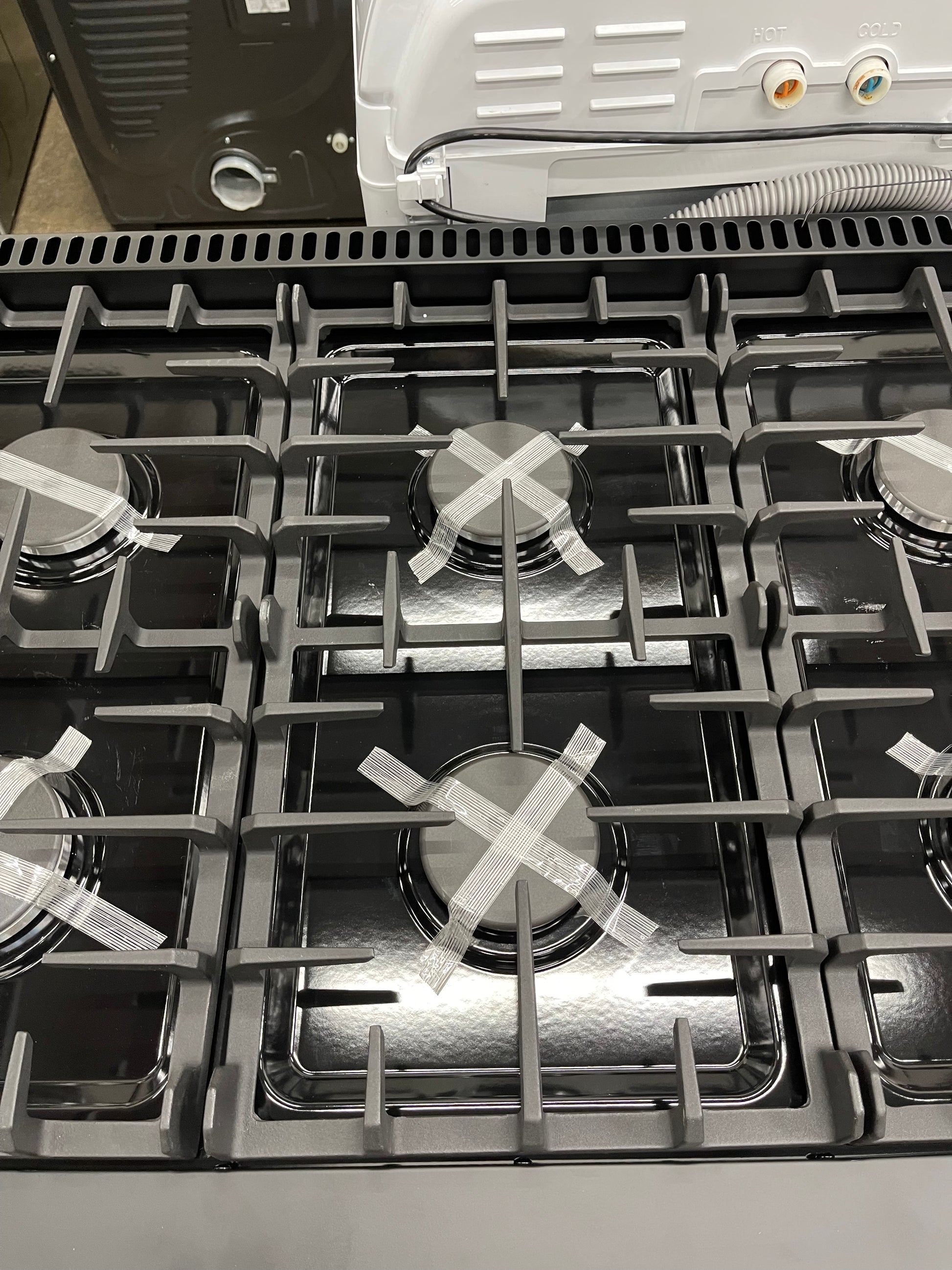 - Black porcelain gas cooktop comes equipped with 6 sealed burners for a versatile setup: two 18,000 btu power burners, two 12,000 btu rapid burners and two 9,000 btu semi-rapid burners