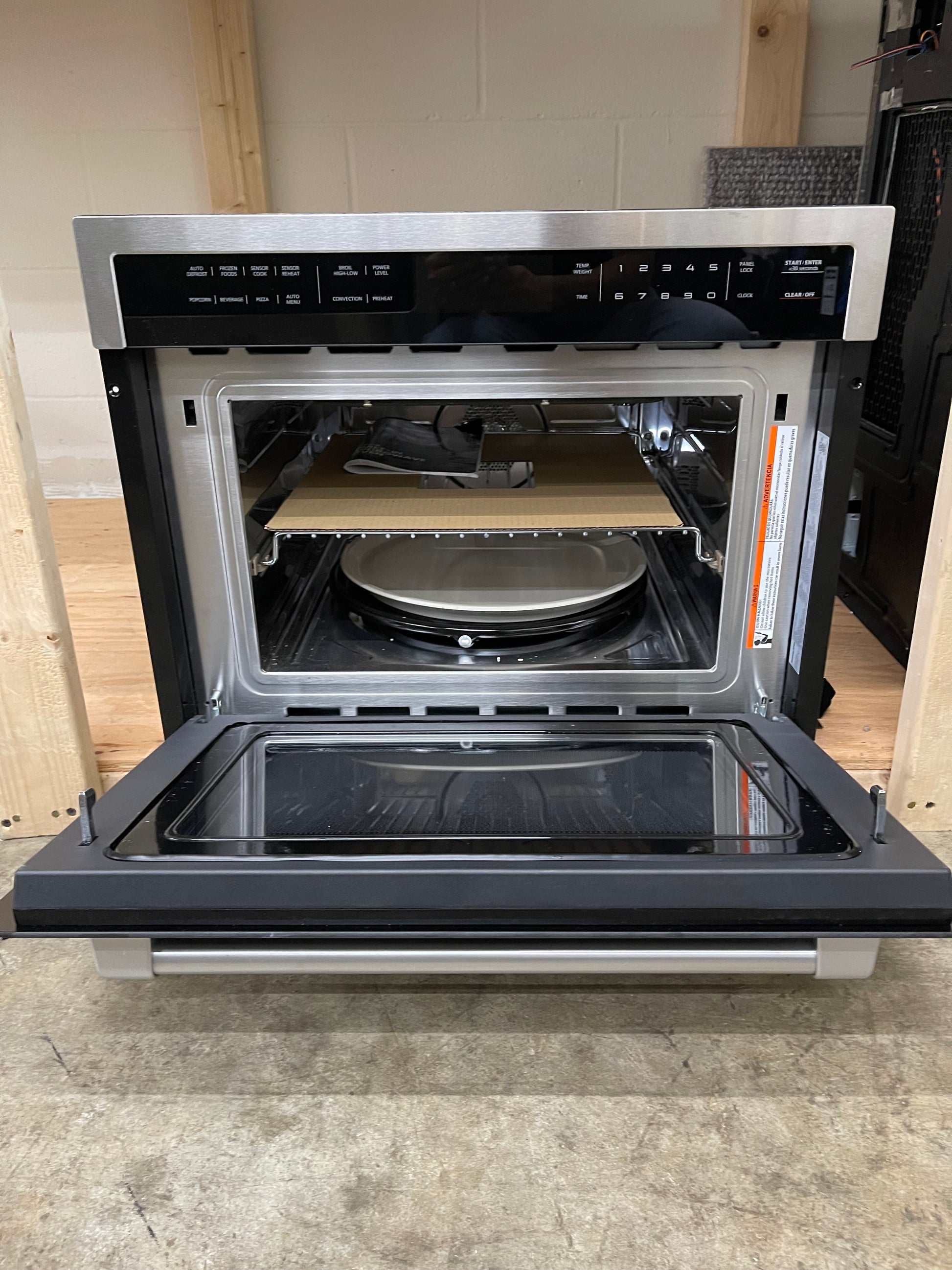 This 24-inch microwave features 1,000 watts, one-touch cooking with 8 auto cook programs, a 1.6 cu.ft capacity, and a space-saving 2-in-1 design. Cleaning is effortless with a nonstick interior and dishwasher-safe turntable, making it a stylish and practical kitchen appliance.