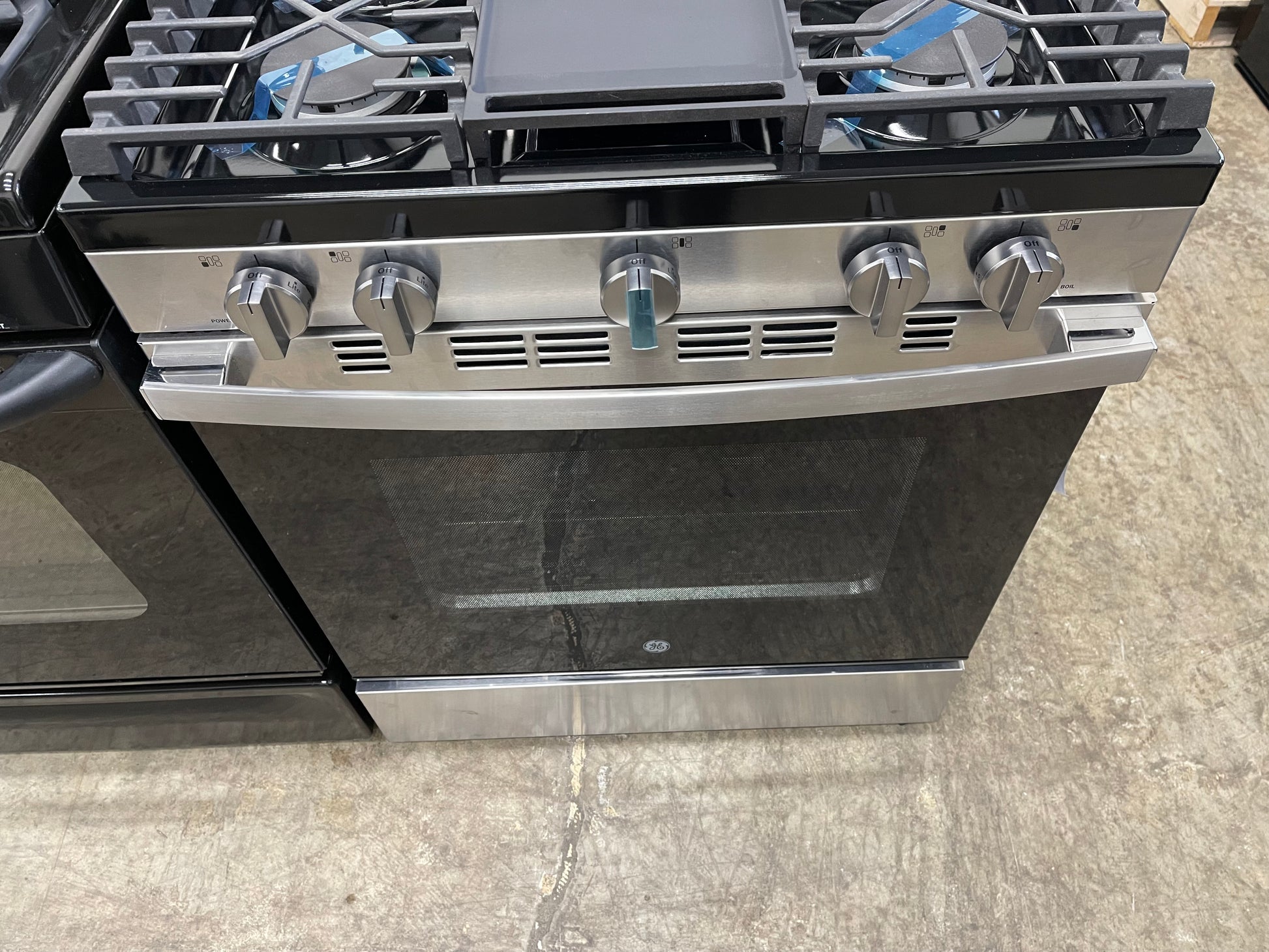 30 Inch Freestanding Gas Smart Range with 5 Sealed Burners This Freestanding Gas Range with Convection and No-Preheat Air Fry from GE brings a touch of elegance to any home kitchen while offering high-performance cooking power. A continuous, edge-to-edge cooktop provides an ample cooking zone and can accommodate any cookware needed to prepare large meals. From the Power Boil burner for high-temperature cooking to the Precise Simmer burner for delicate foods, the five sealed burners can meet all your culinary requirements. The cooktop also features a center oval burner perfect for a Griddle, adding even more versatility. The 5.3 cu. ft. oven provides extra space for more dishes and uses a steam cleaning option that cleans the oven cavity in a 30-minute cycle with less odor and heat. Plus, it features a full-width storage drawer that gives room for cooking accessories and cookware storage for added convenience in the kitchen.