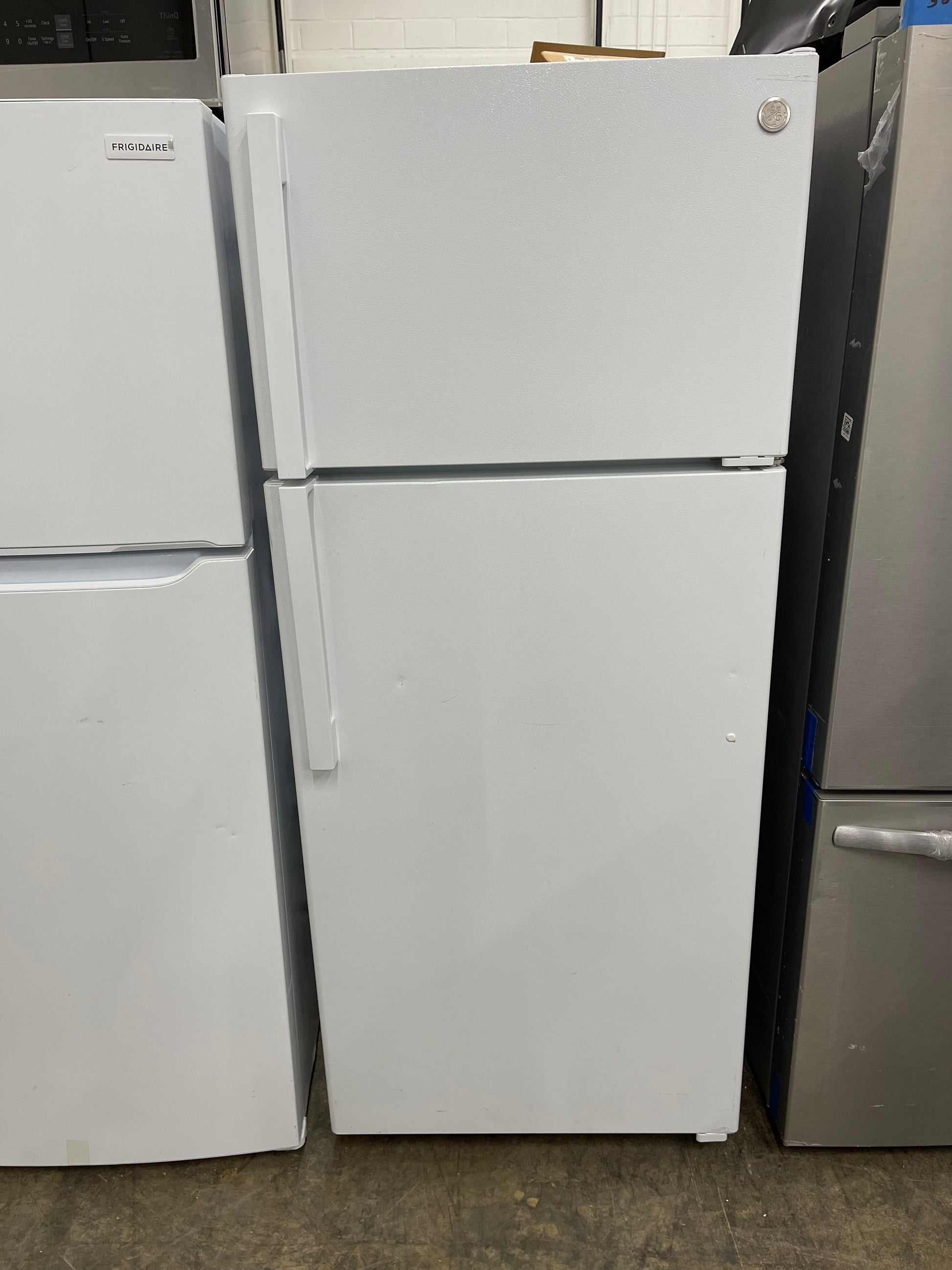 GE GTS18GTNRWW 28 Inch Top Freezer Refrigerator with 17.5 Cu. Ft. Total Capacity, Adjustable Edge to Edge Glass Shelves, Sliding Deli Drawer, LED Lighting, Spillproof Freezer Floor, Gallon Door Storage, and Sabbath Mode: White
