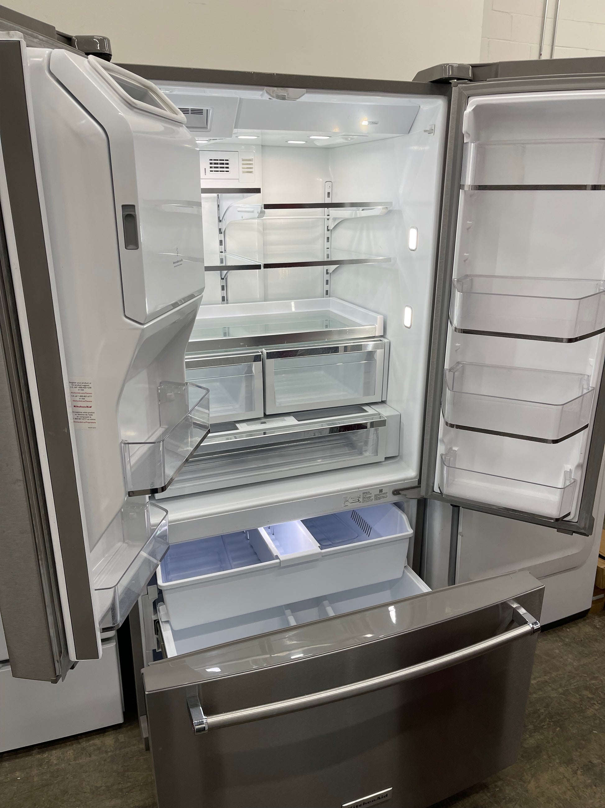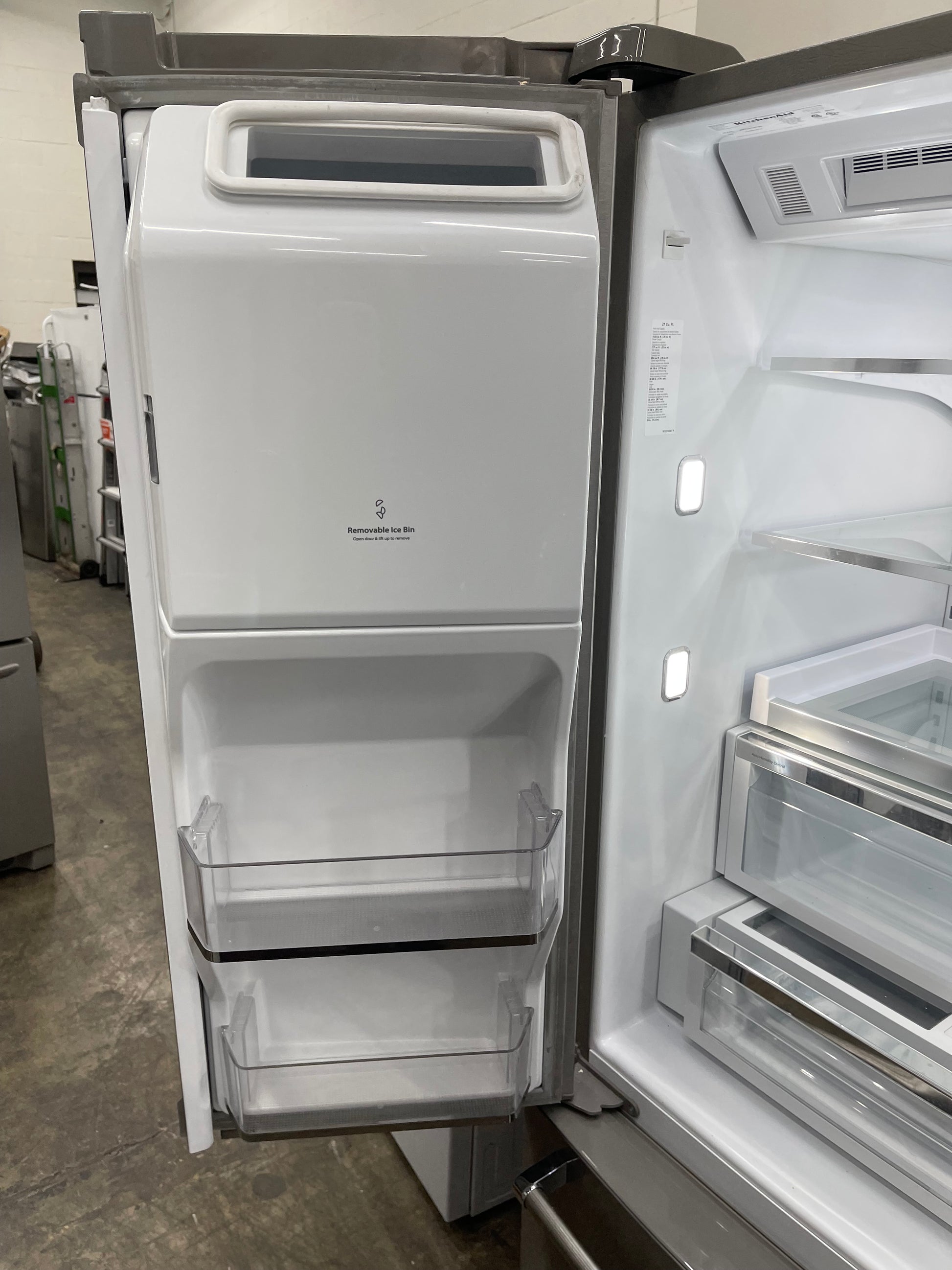 KitchenAid KRFF507HPS 36 Inch Freestanding French Door Refrigerator with 26.8 cu. ft. Total Capacity, PrintShield Finish, ExtendFresh Temperature Management System, External Ice/Water Dispenser, Water Filtered, Star-K Certified, and ENERGY STAR : Stain